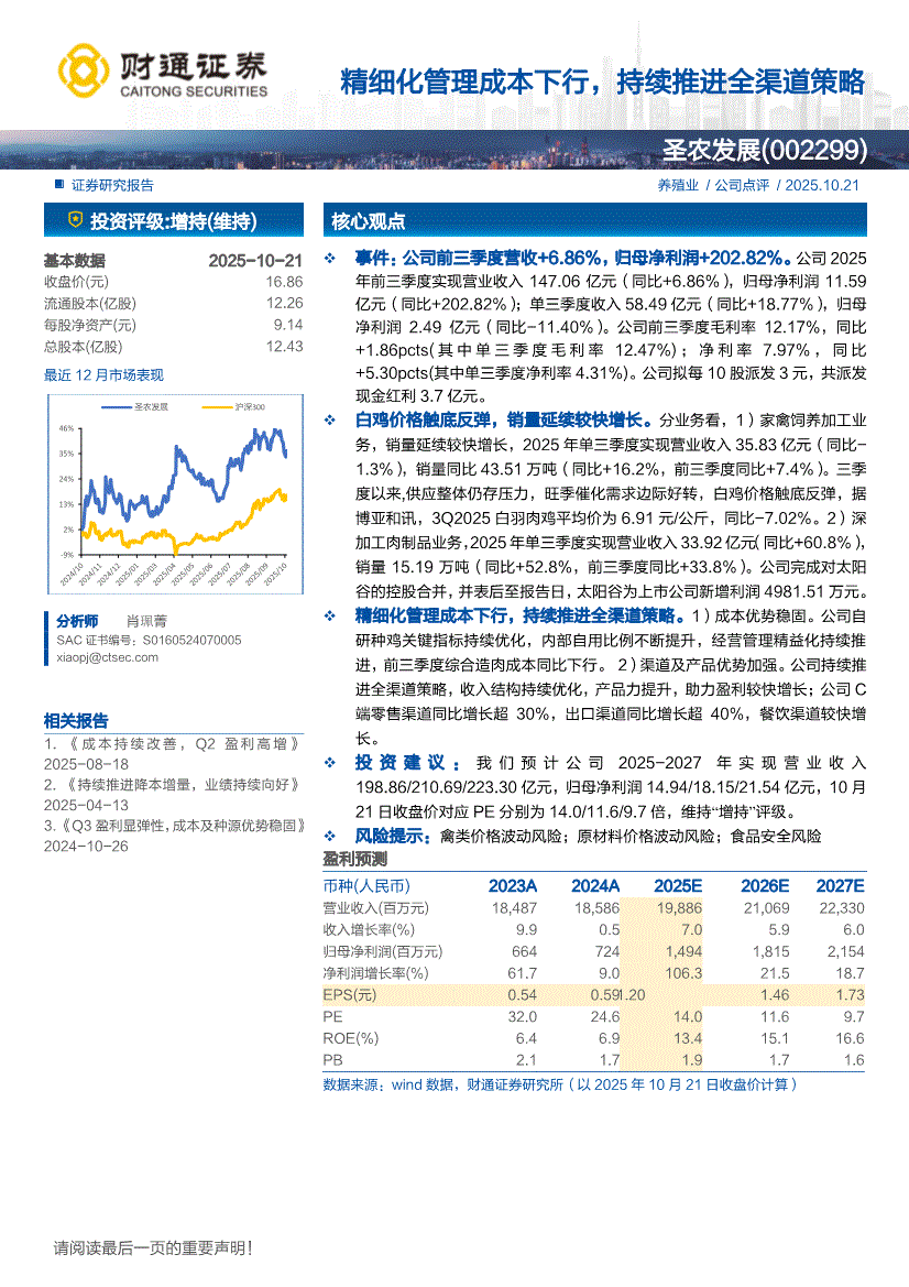 圣农发展:财通证券-圣农发展-002299-精细化管理成本下行,持续推进全渠道策略-251021