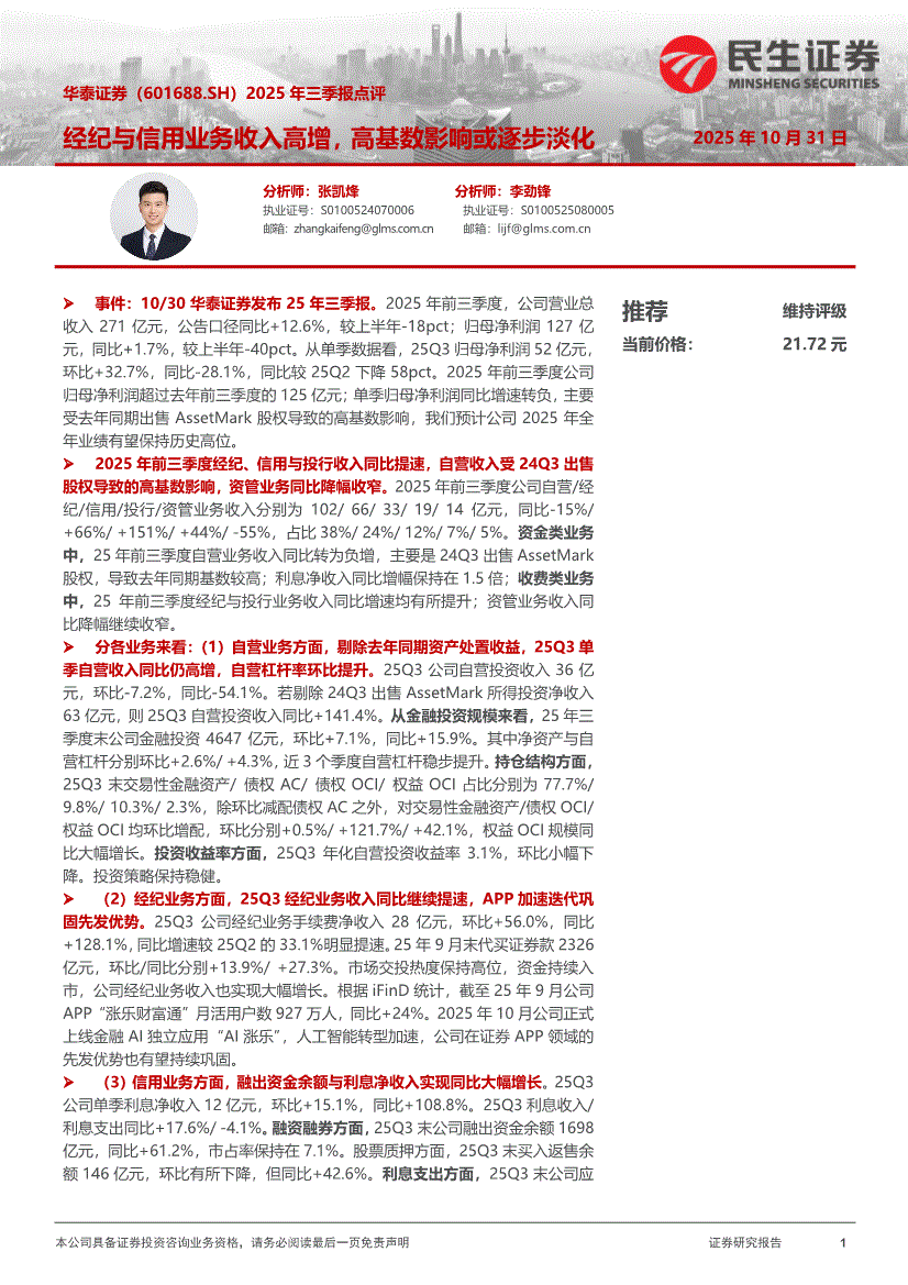 华泰证券:民生证券-华泰证券-601688-2025年三季报点评:经纪与信用业务收入高增,高基数影响或逐步淡化-251031