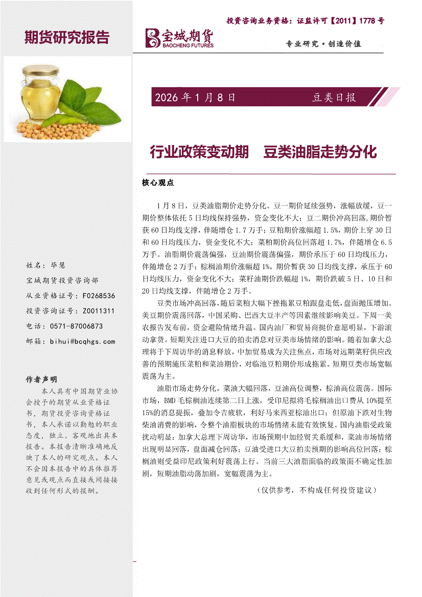 宝城期货-豆类日报:行业政策变动期,豆类油脂走势分化-260108