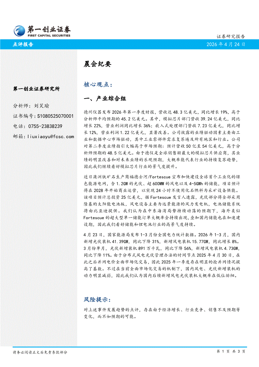 第一创业-晨会纪要-260420