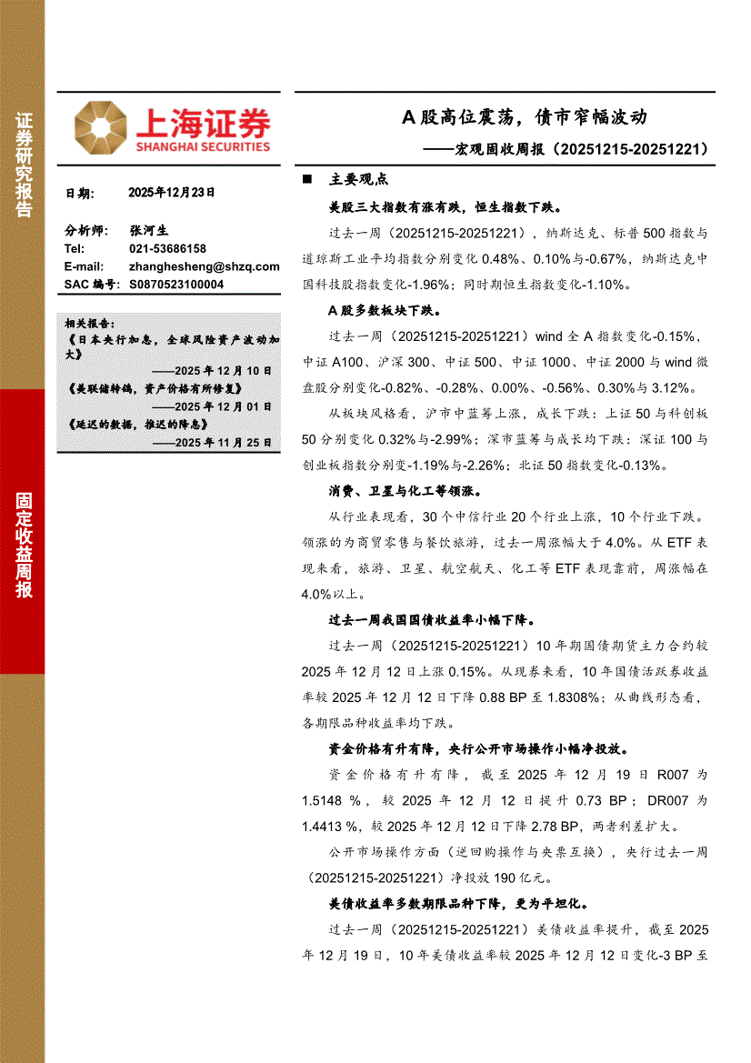 上海证券-宏观固收周报:A股高位震荡,债市窄幅波动-251223