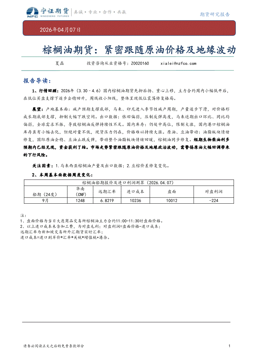 宁证期货-棕榈油期货:紧密跟随原油价格及地缘波动-260407