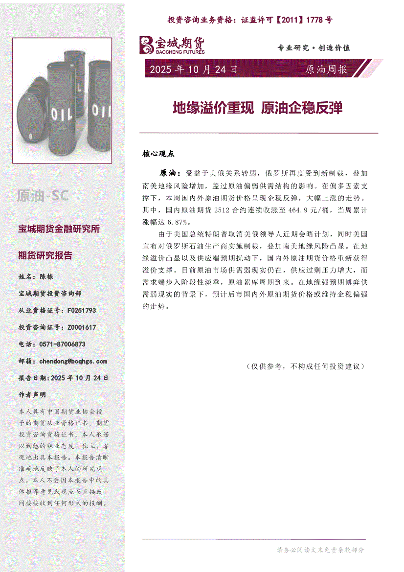 宝城期货-原油周报:地缘溢价重现,原油企稳反弹-251024