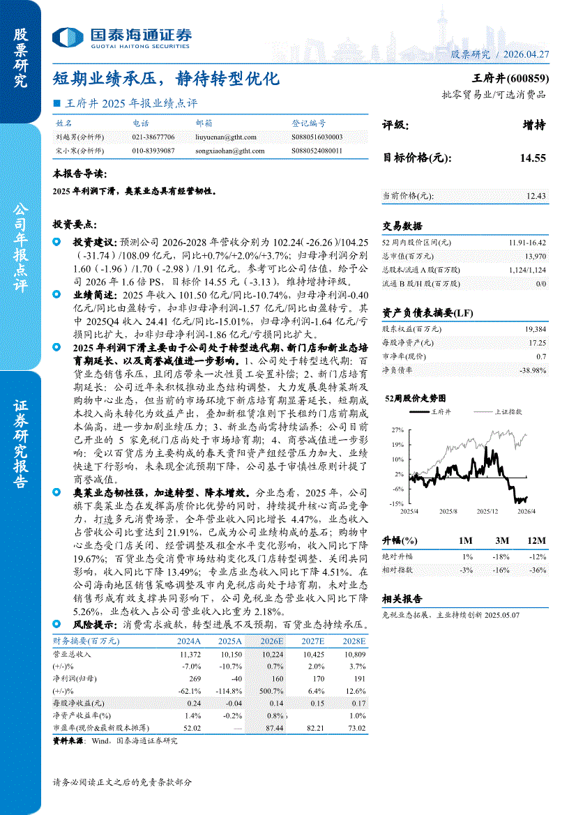 王府井:国泰海通证券-王府井-600859-2025年报业绩点评:短期业绩承压,静待转型优化-260427