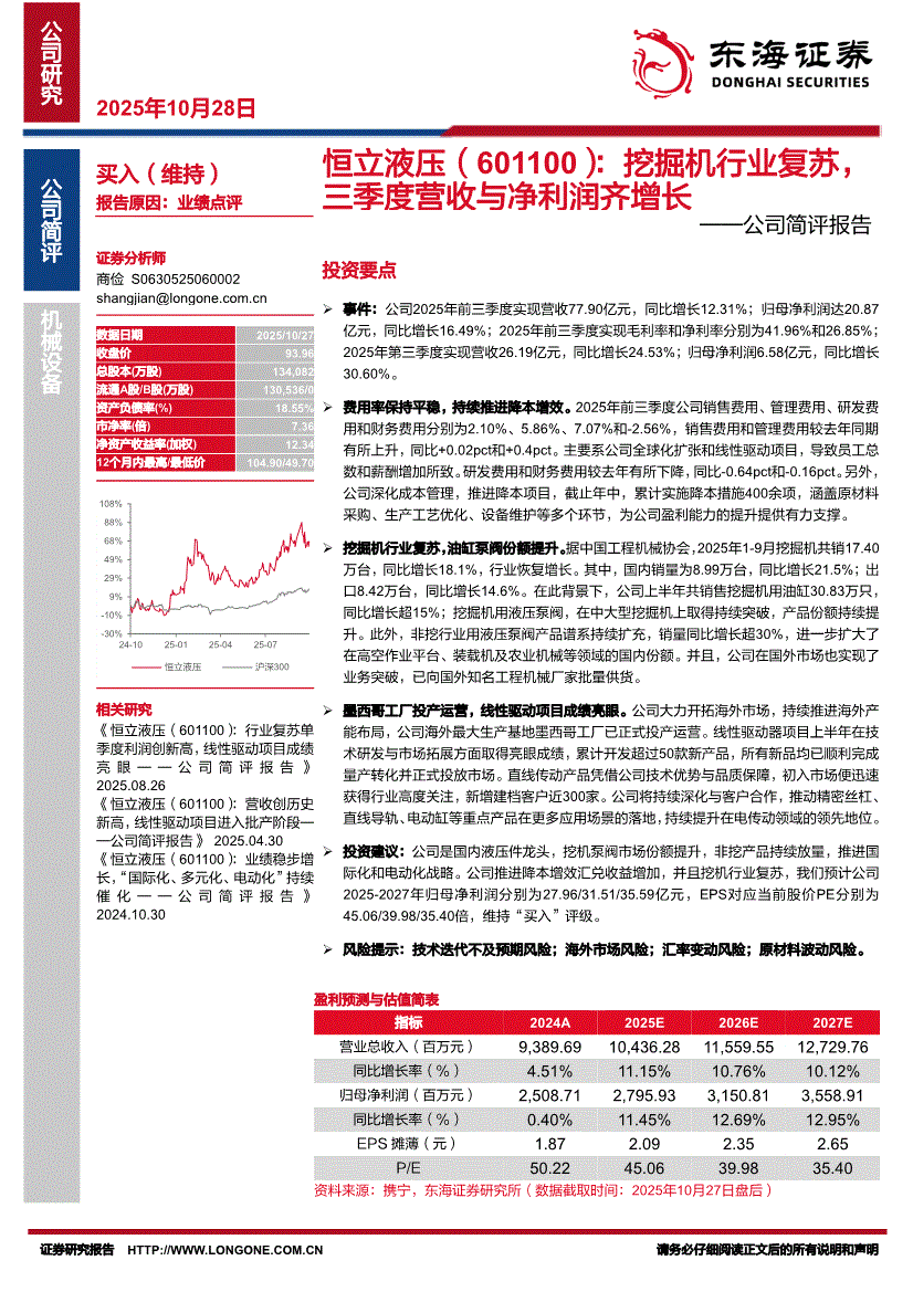 恒立液压:东海证券-恒立液压-601100-公司简评报告:挖掘机行业复苏,三季度营收与净利润齐增长-251028