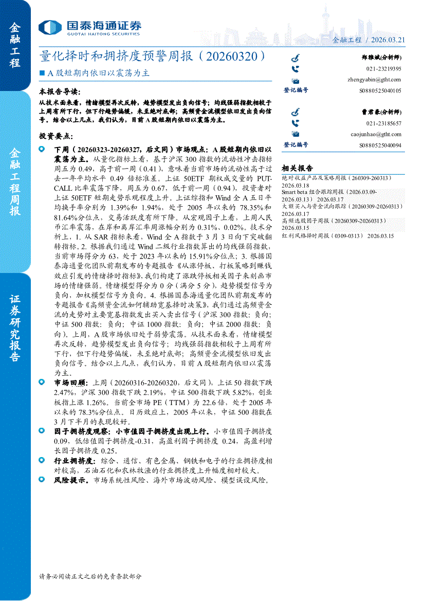 国泰海通证券-量化择时和拥挤度预警周报(20260320):A股短期内依旧以震荡为主-260321