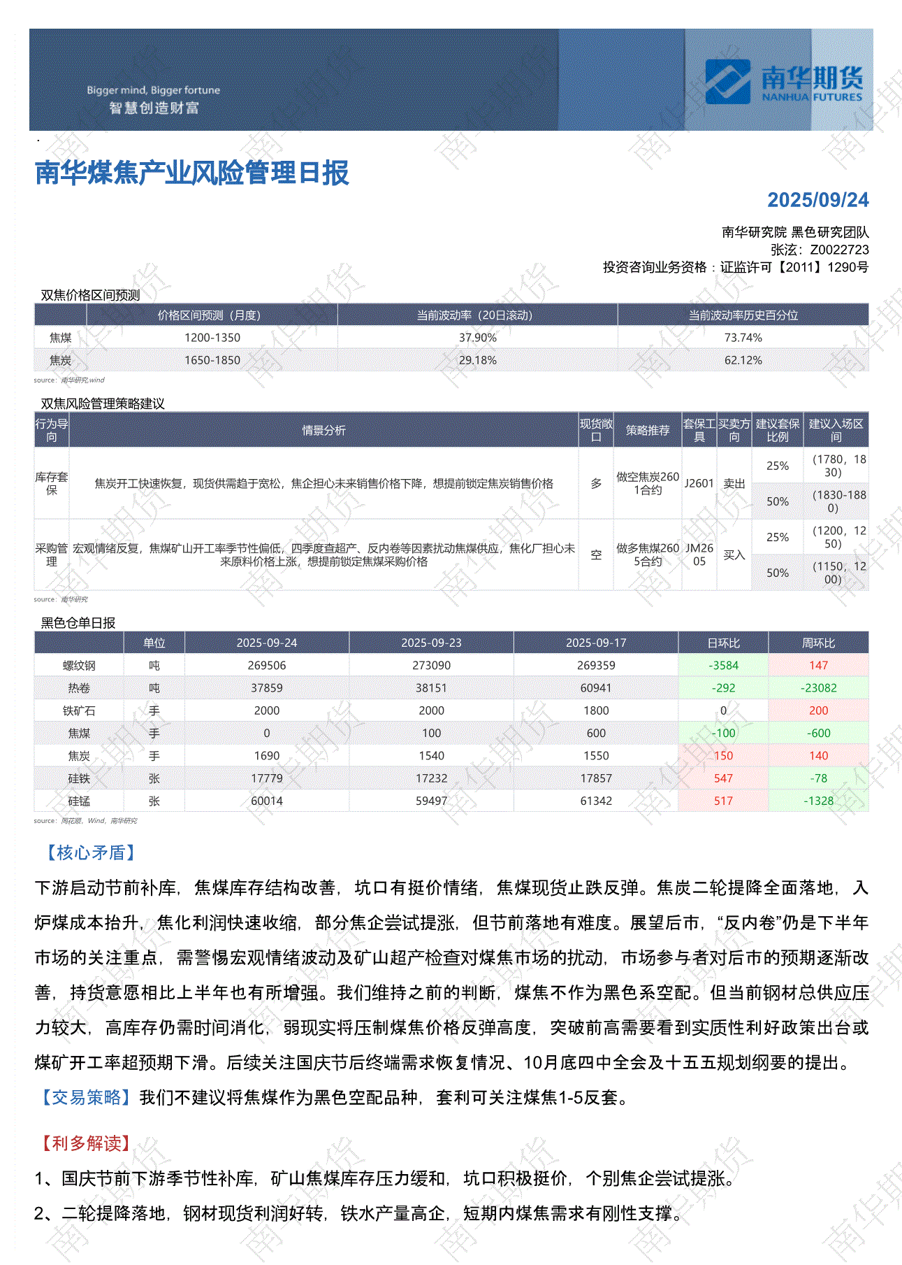南华期货-南华煤焦产业风险管理日报-250924