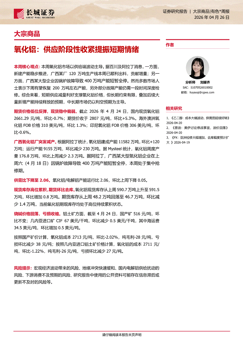 长城证券-大宗商品:氧化铝,供应阶段性收紧提振短期情绪-260426