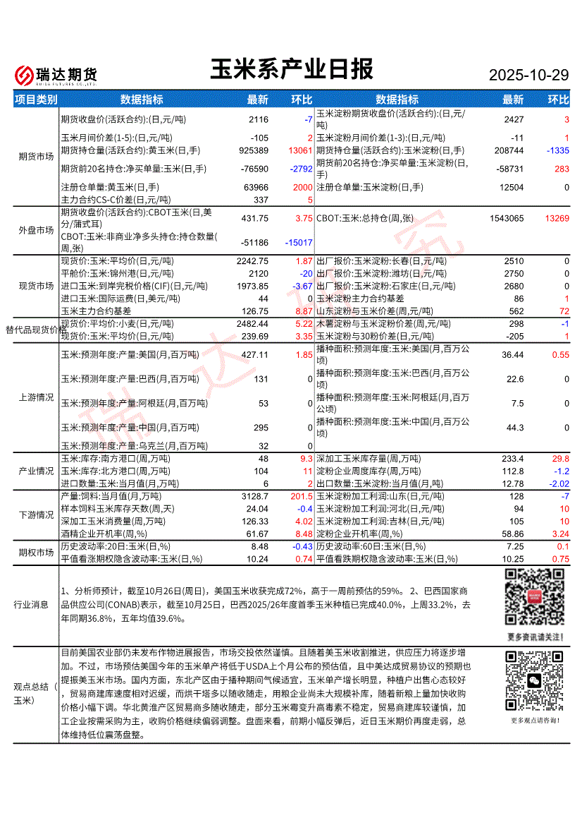 瑞达期货-玉米类市场周报:现货价格偏弱调整,期价维持低位震荡-251031