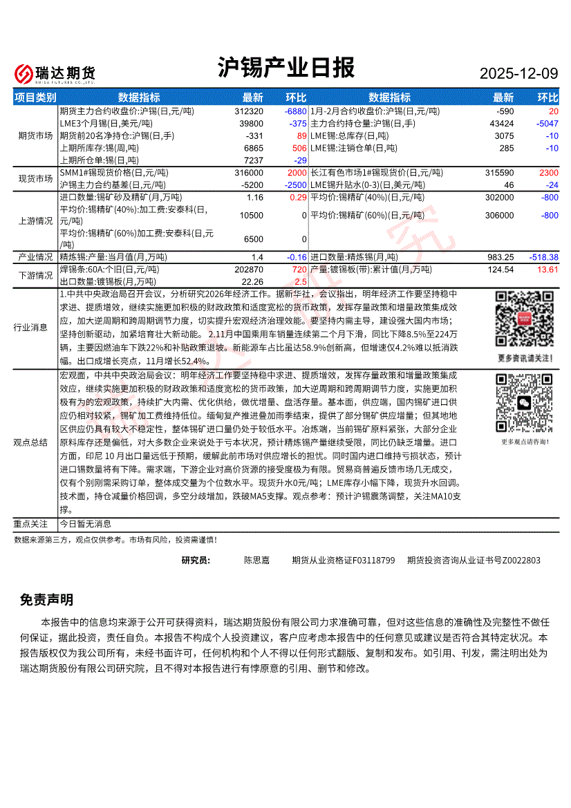 瑞达期货-沪铜市场周报:供给小增需求谨慎,沪铜或将震荡运行-251212