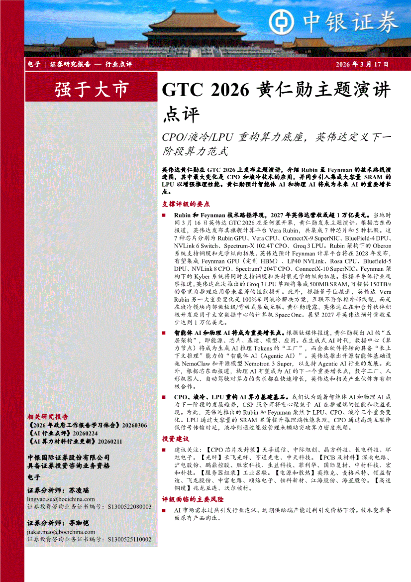 电子行业:中银国际-电子行业GTC 2026黄仁勋主题演讲点评:CPO/液冷/LPU重构算力底座,英伟达定义下一阶段算力范式-260317