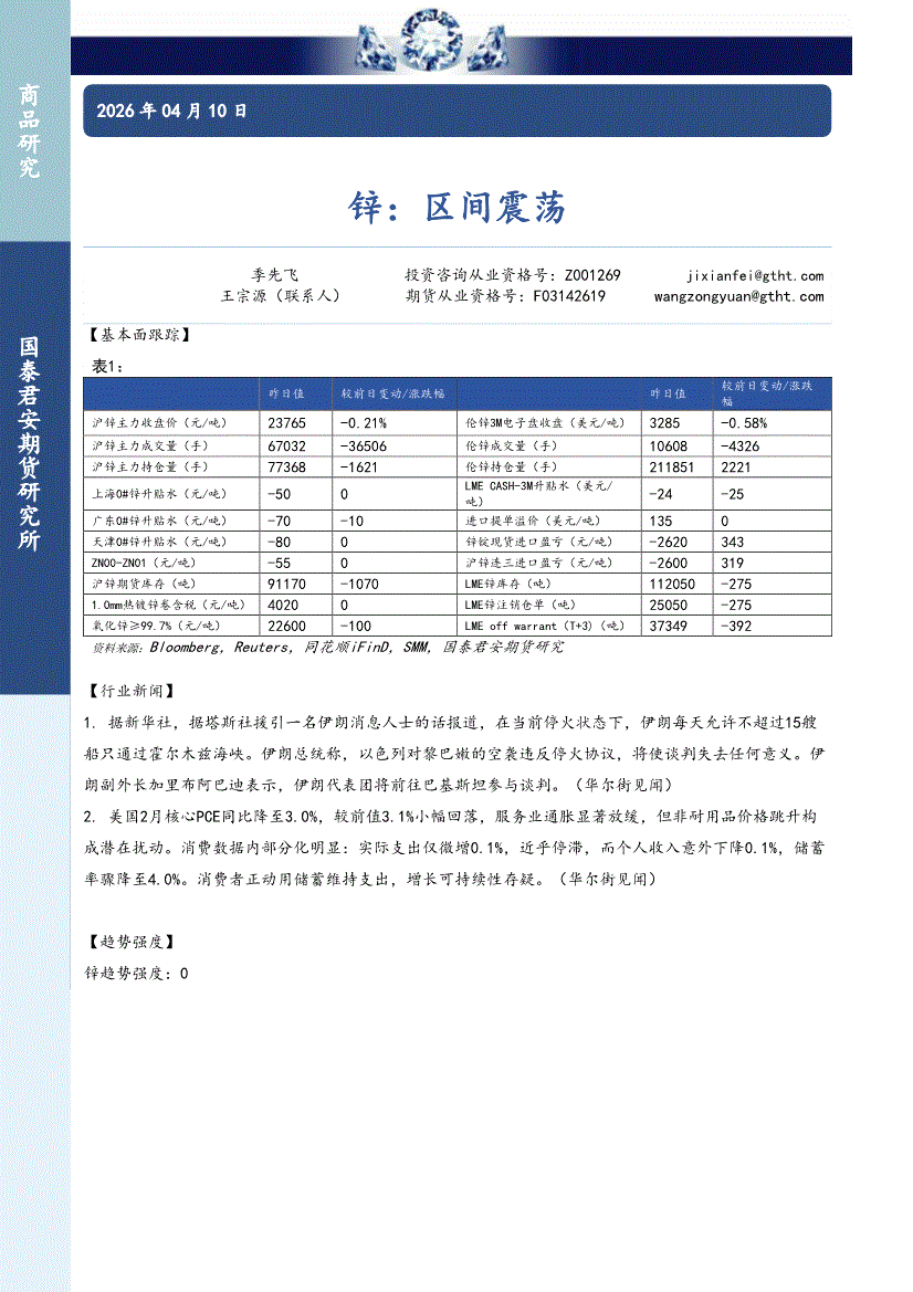 国泰君安期货-锌:区间震荡-260410