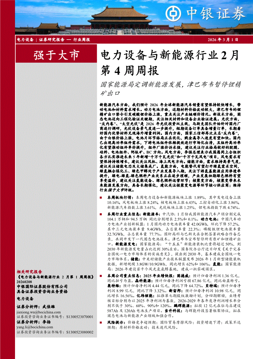 电力设备与新能源行业:中银国际-电力设备与新能源行业2月第4周周报:国家能源局定调新能源发展,津巴布韦暂停锂精矿出口-260301