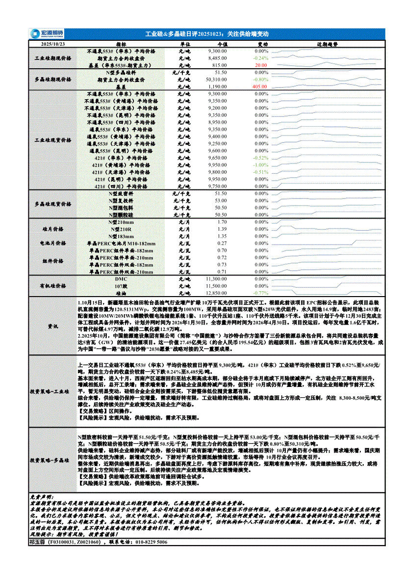 宏源期货-有色金属周报~工业硅&多晶硅:暂无明显变动,价格维持区间整理-251028