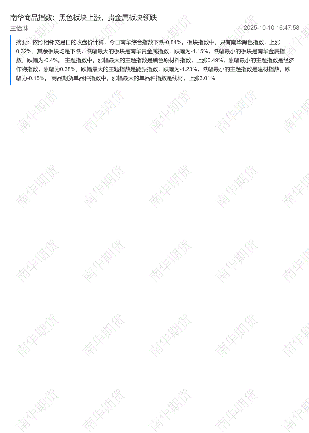 南华期货-南华商品指数:黑色板块上涨,贵金属板块领跌-251010