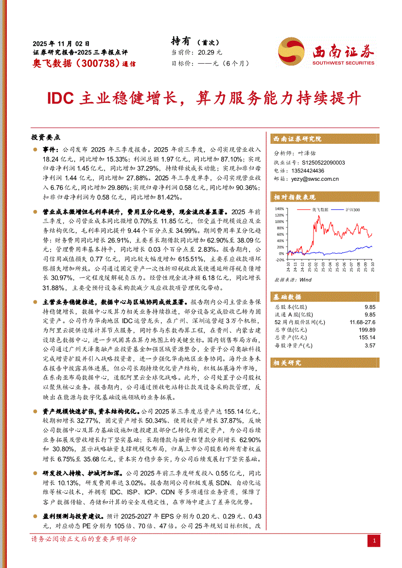 奥飞数据:西南证券-奥飞数据-300738-IDC主业稳健增长,算力服务能力持续提升-251102