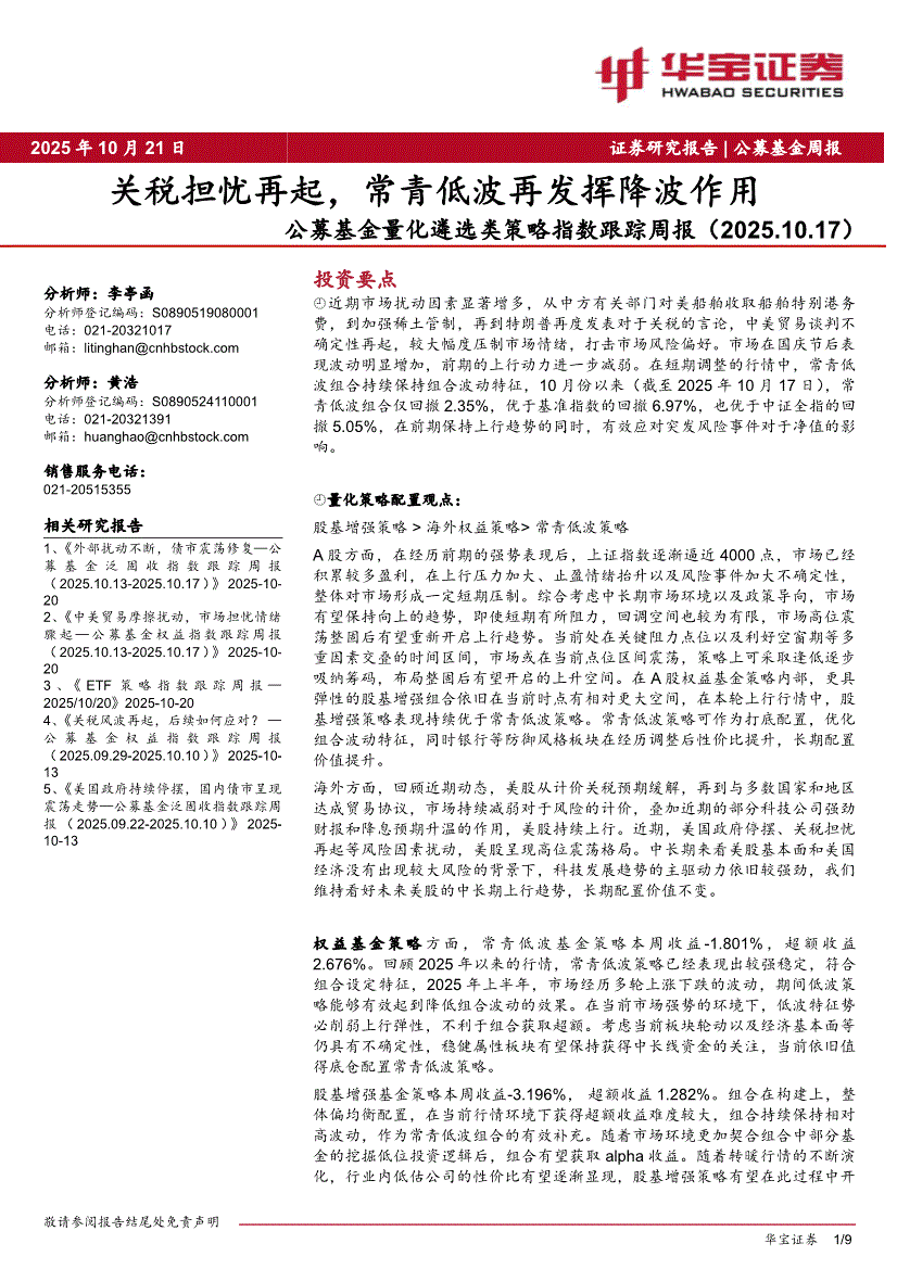 华宝证券-公募基金量化遴选类策略指数跟踪周报:关税担忧再起,常青低波再发挥降波作用-251021