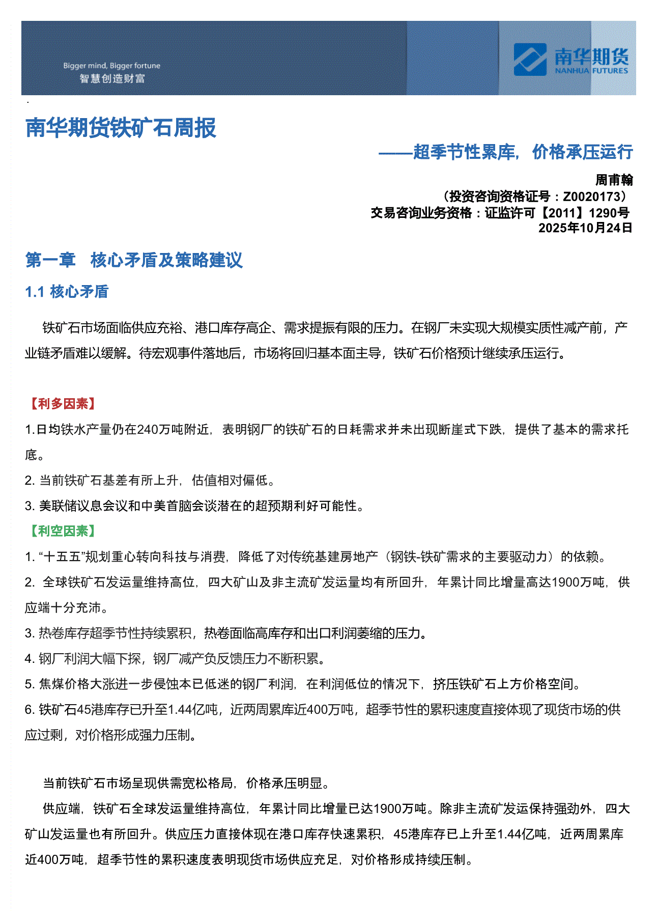 南华期货-铁矿石周报:超季节性累库,价格承压运行-251024