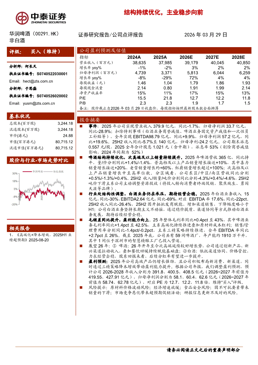华润啤酒:中泰证券-华润啤酒-0291.HK-结构持续优化,主业稳步向前-260329