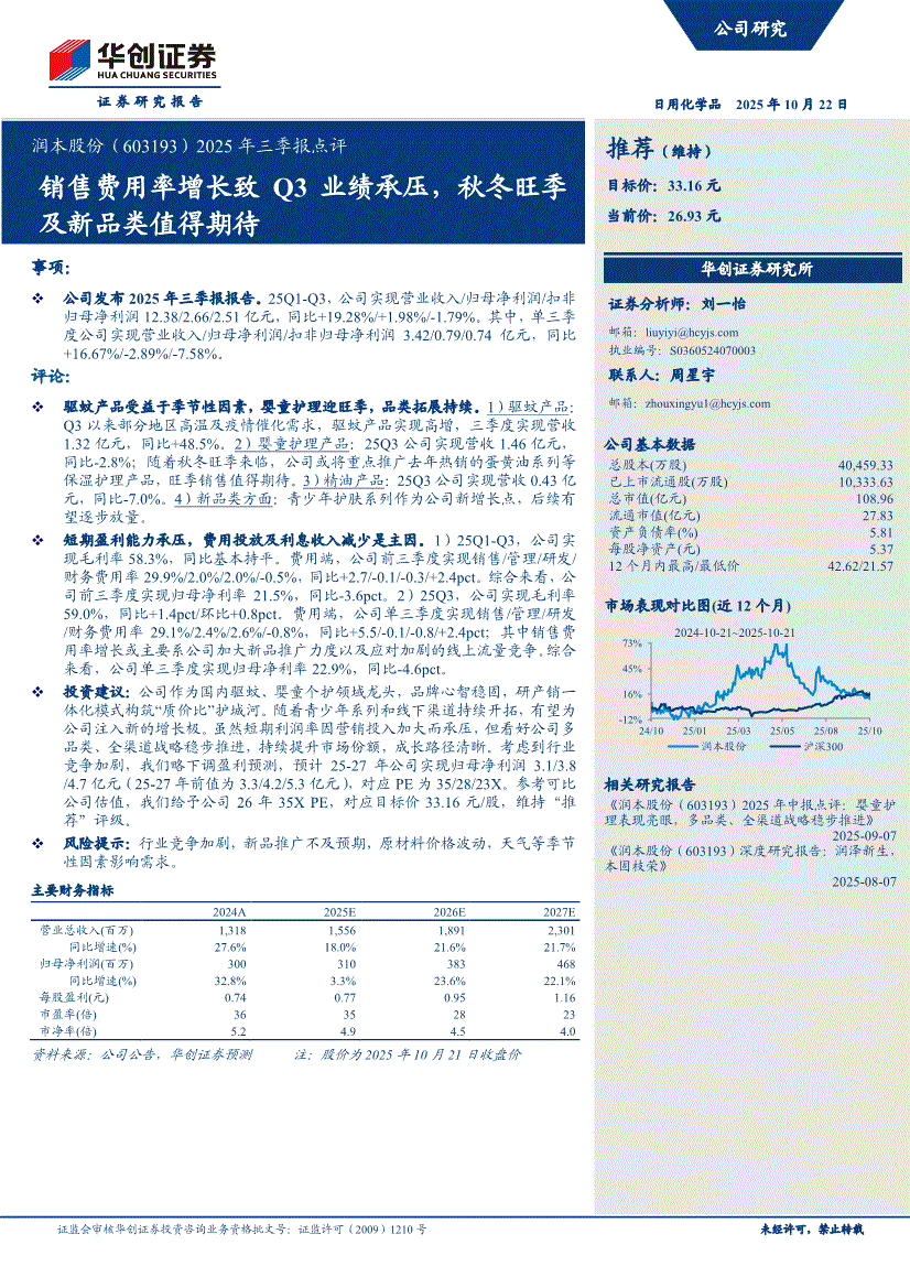润本股份:华创证券-润本股份-603193-2025年三季报点评:销售费用率增长致Q3业绩承压,秋冬旺季及新品类值得期待-251022