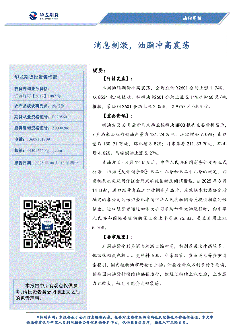 华龙期货-油脂周报:消息刺激,油脂冲高震荡-250818