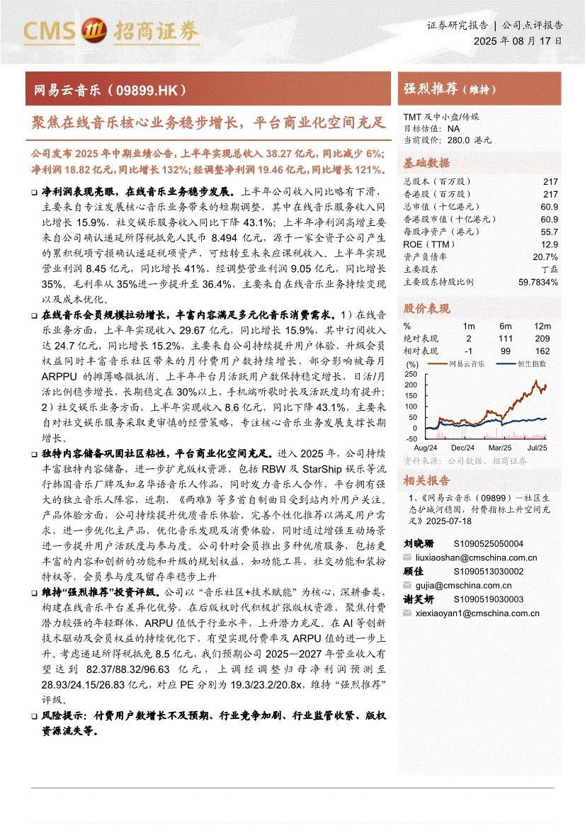 网易云音乐:招商证券-网易云音乐-9899.HK-聚焦在线音乐核心业务稳步增长,平台商业化空间充足-250817
