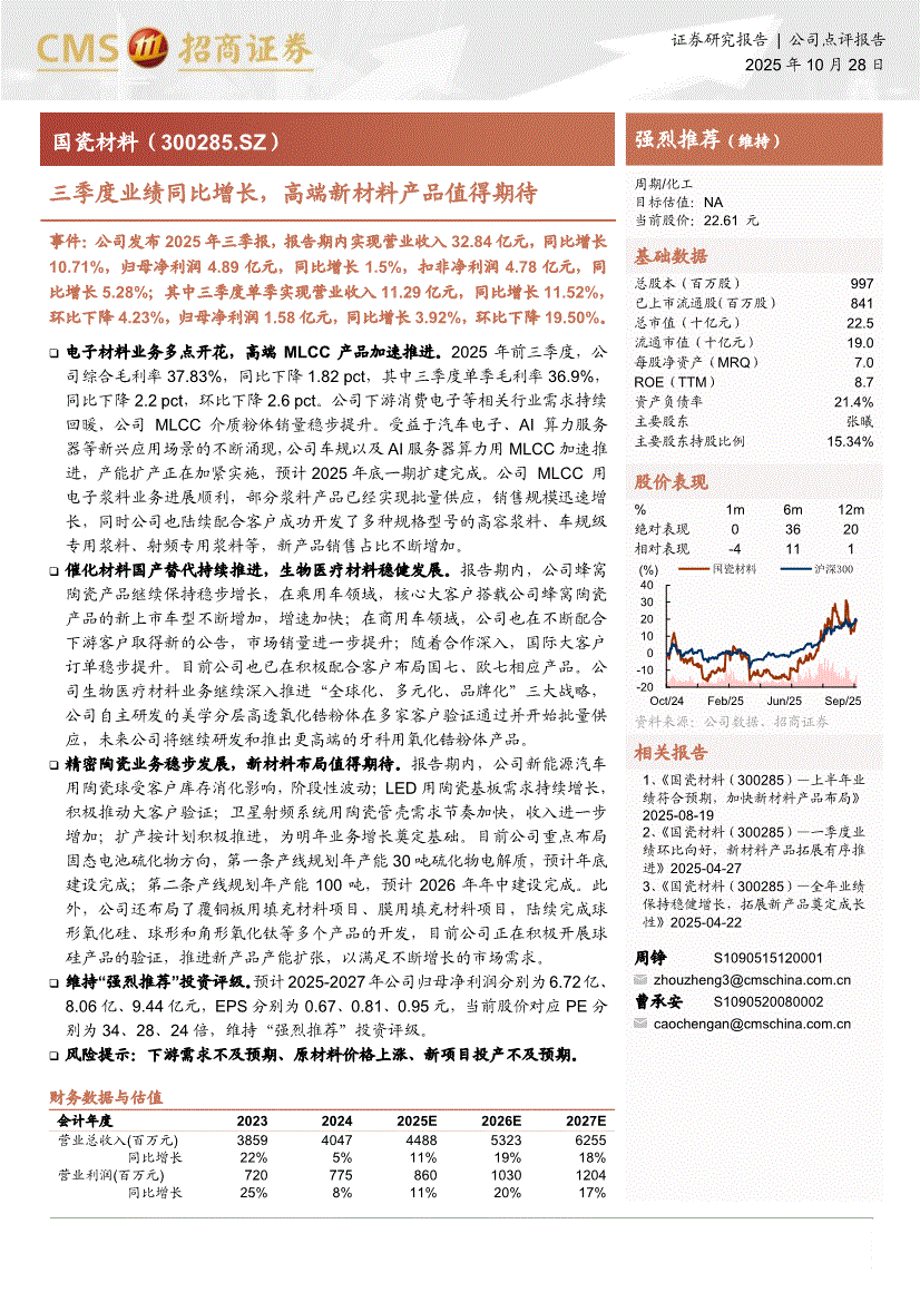 国瓷材料:招商证券-国瓷材料-300285-三季度业绩同比增长,高端新材料产品值得期待-251028