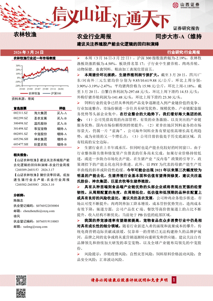 农业:山西证券-农业行业周报:建议关注养殖股产能去化逻辑的回归和演绎-260324