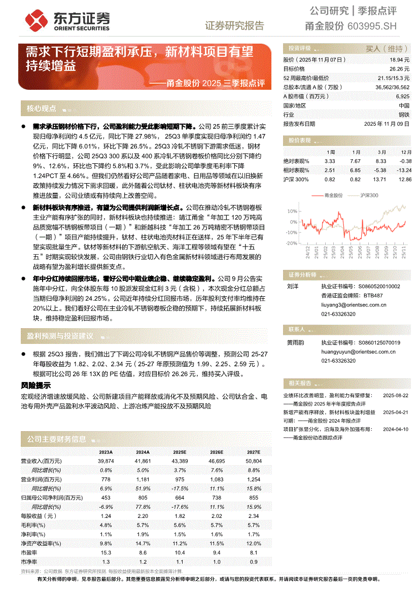 甬金股份:东方证券-甬金股份-603995-2025三季报点评:需求下行短期盈利承压,新材料项目有望持续增益-251109