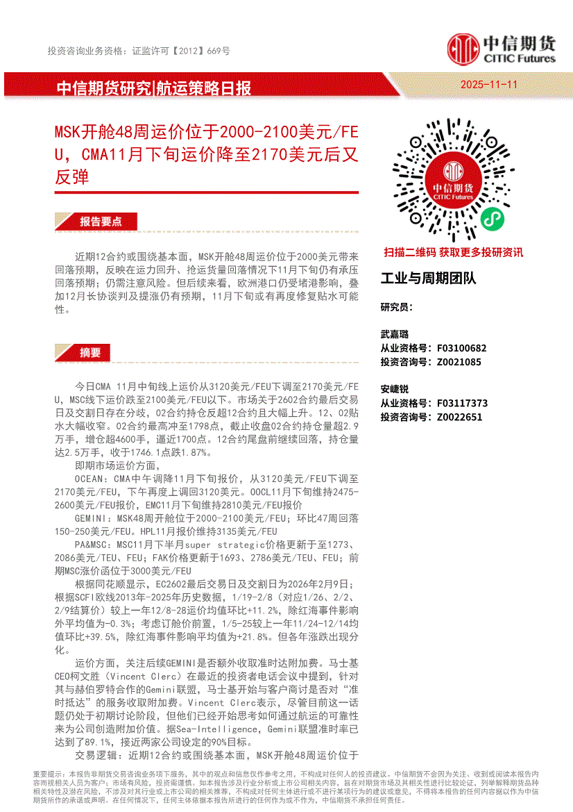 中信期货-航运策略日报:MSK开舱48周运价位于2000~2100美元/FEU,CMA11月下旬运价降至2170美元后又反弹-251111