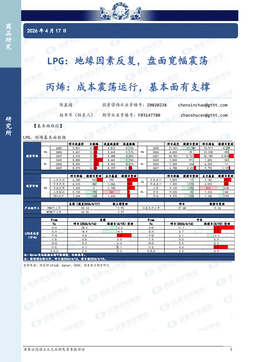 国泰君安期货-LPG:地缘因素反复,盘面宽幅震荡,丙烯,成本震荡运行,基本面有支撑-260417