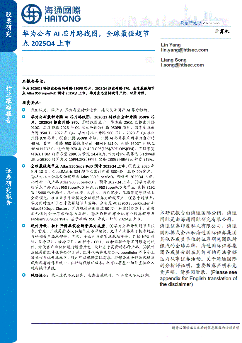 计算机行业:海通国际-计算机行业:华为公布AI芯片路线图,全球最强超节点2025Q4上市-250929