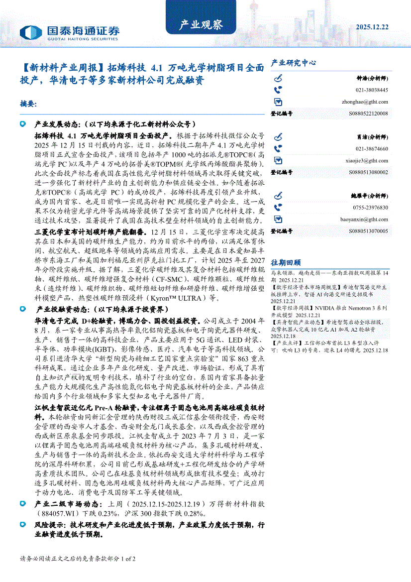 国泰海通证券-产业观察:【新材料产业周报】拓烯科技4.1万吨光学树脂项目全面投产,华清电子等多家新材料公司完成融资-251222