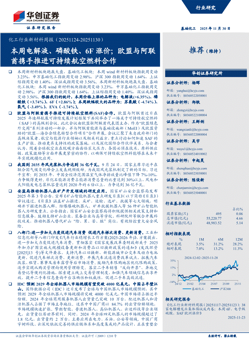 化工行业:华创证券-化工行业新材料周报:本周电解液、磷酸铁、6F涨价;欧盟与阿联酋携手推进可持续航空燃料合作-251130