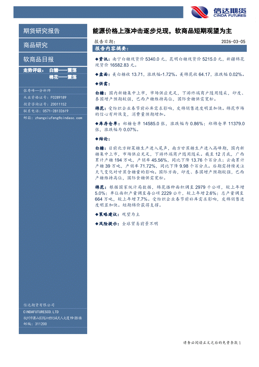 信达期货-软商品日报:能源价格上涨冲击逐步兑现,软商品短期观望为主-260305