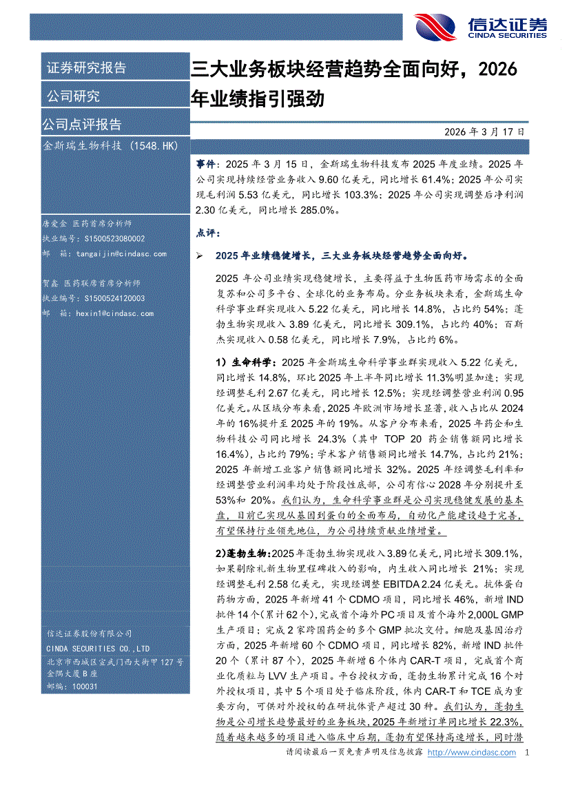 金斯瑞生物科技:信达证券-金斯瑞生物科技-1548.HK-三大业务板块经营趋势全面向好,2026年业绩指引强劲-260317