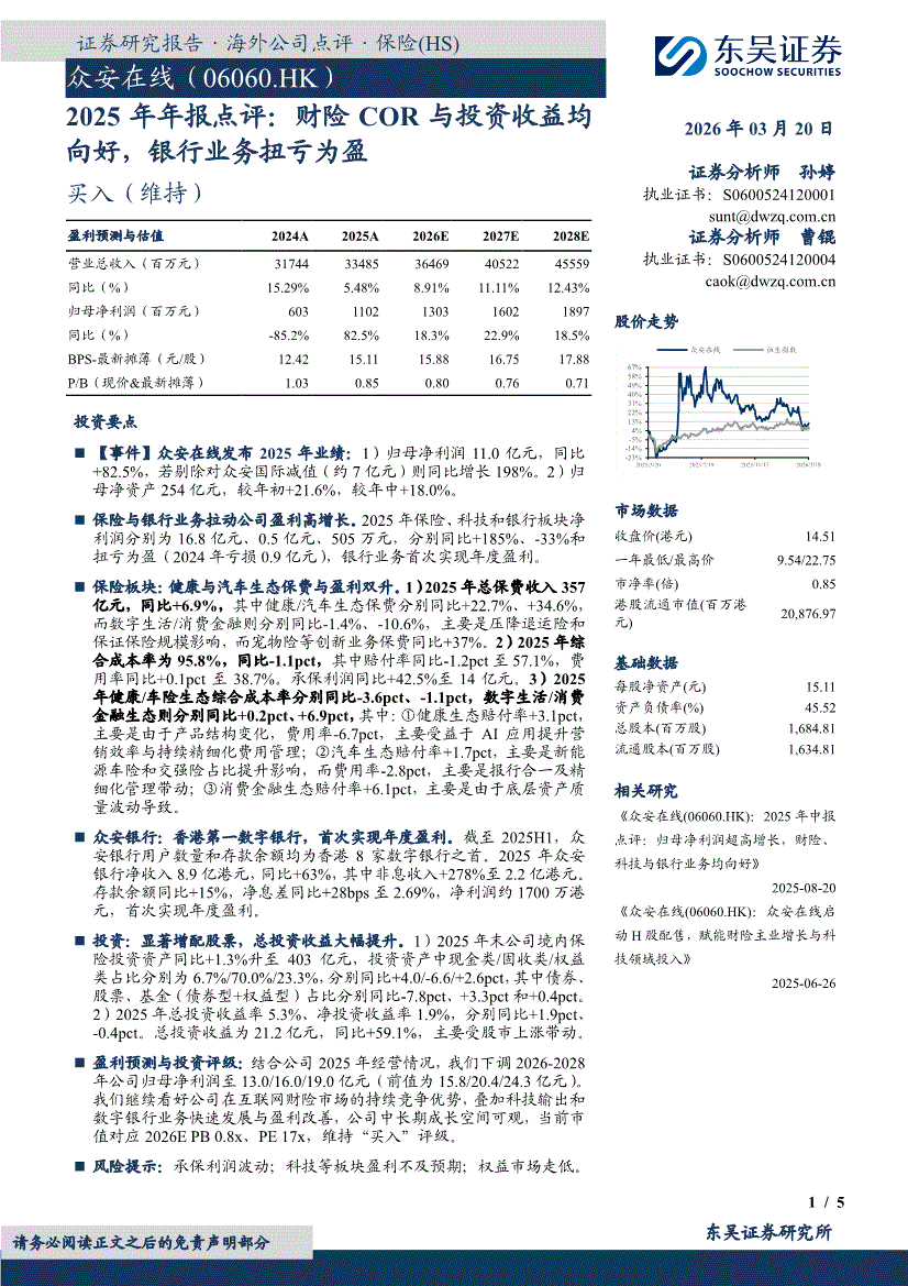 众安在线:东吴证券-众安在线-6060.HK-2025年年报点评:财险COR与投资收益均向好,银行业务扭亏为盈-260320
