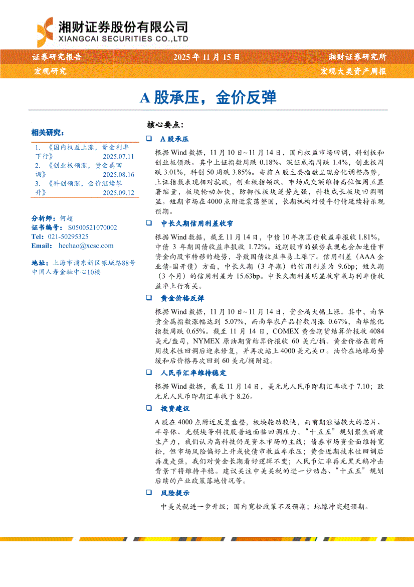湘财证券-宏观大类资产周报:A股承压,金价反弹-251115