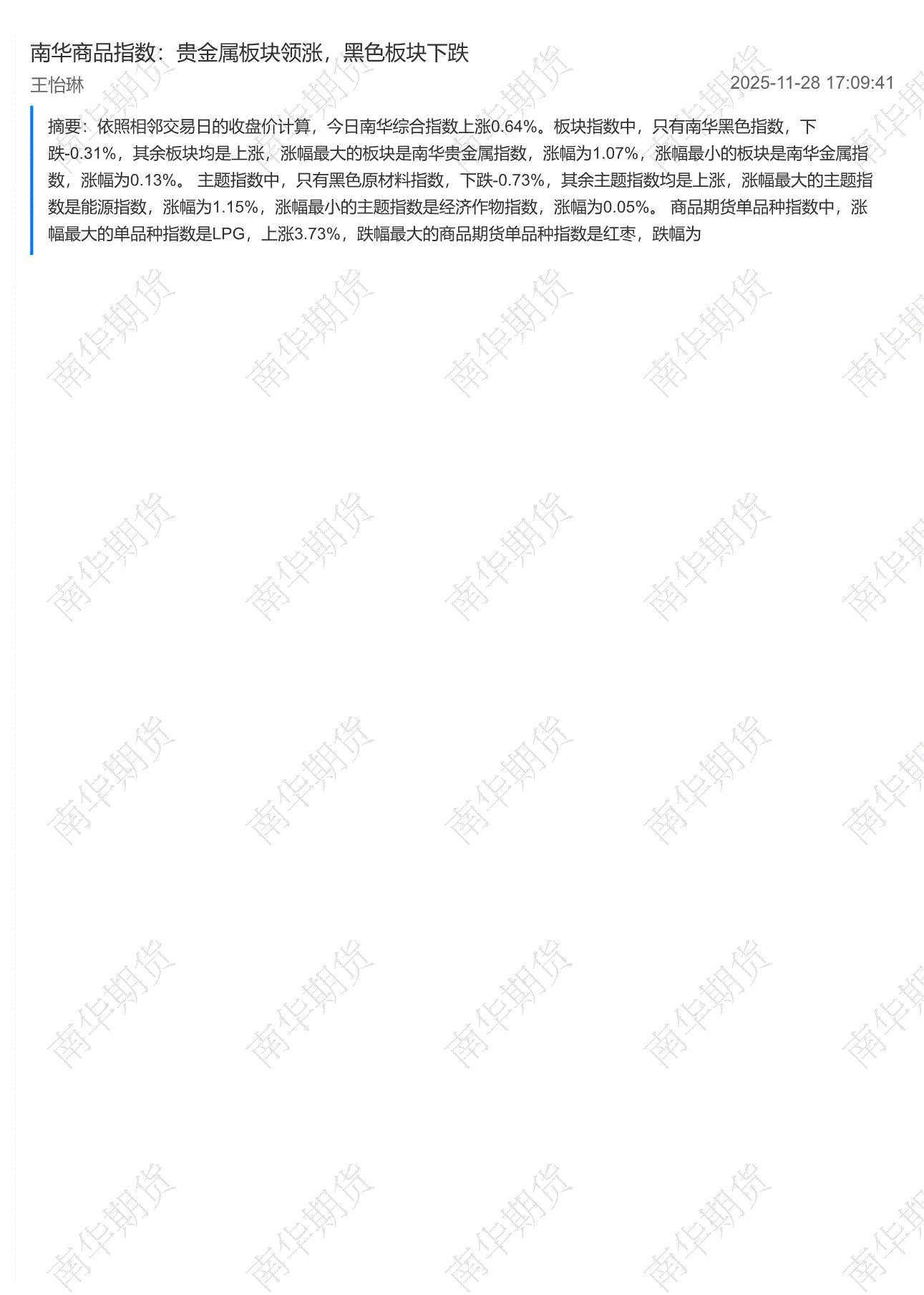 南华期货-南华商品指数:贵金属板块领涨,黑色板块下跌-251128