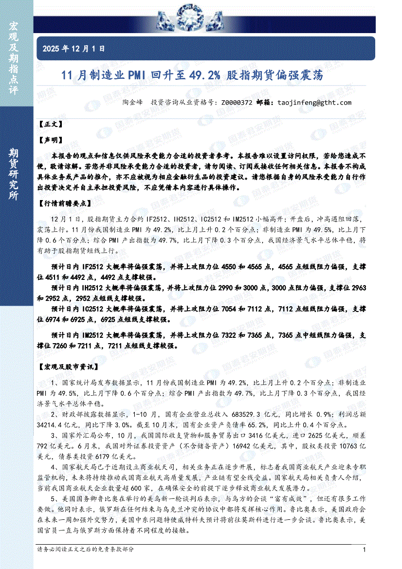 国泰君安期货-11月制造业PMI回升至49.2%,股指期货偏强震荡-251201