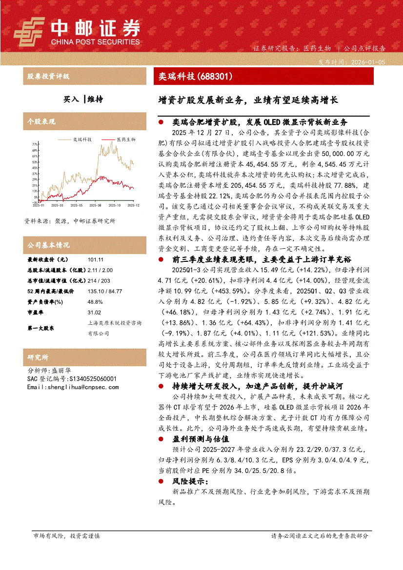 奕瑞科技:中邮证券-奕瑞科技-688301-增资扩股发展新业务,业绩有望延续高增长-260105