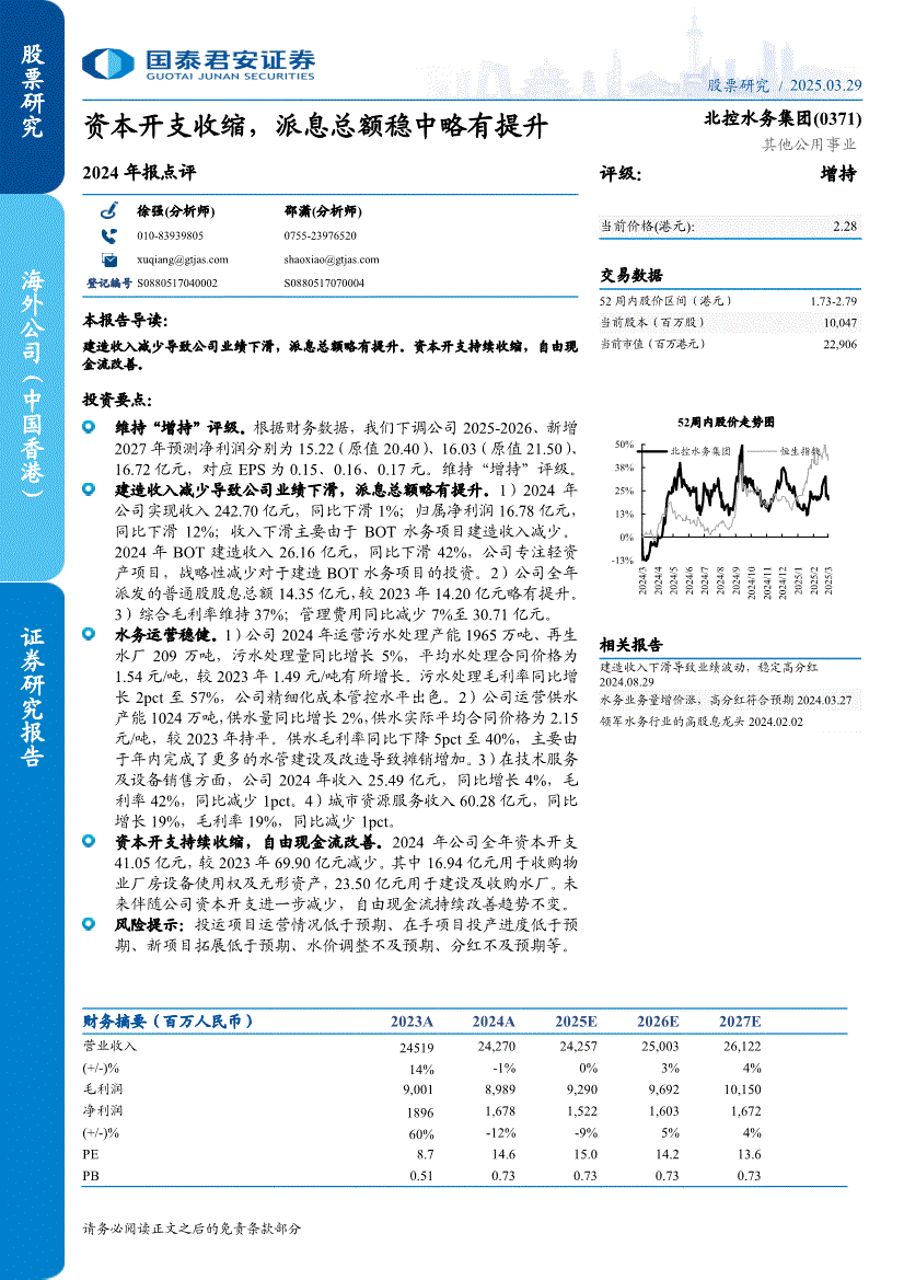 北控水务集团:国泰君安-北控水务集团-0371.HK-2024年报点评:资本开支收缩,派息总额稳中略有提升-250329