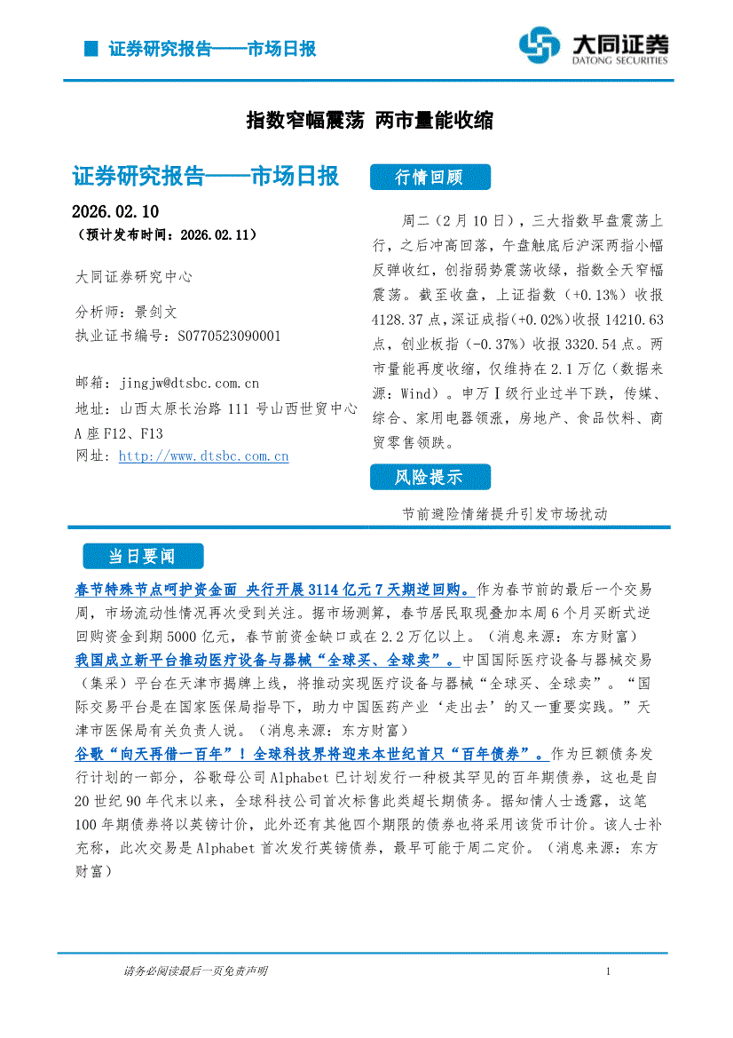 大同证券-市场日报:指数窄幅震荡,两市量能收缩-260210