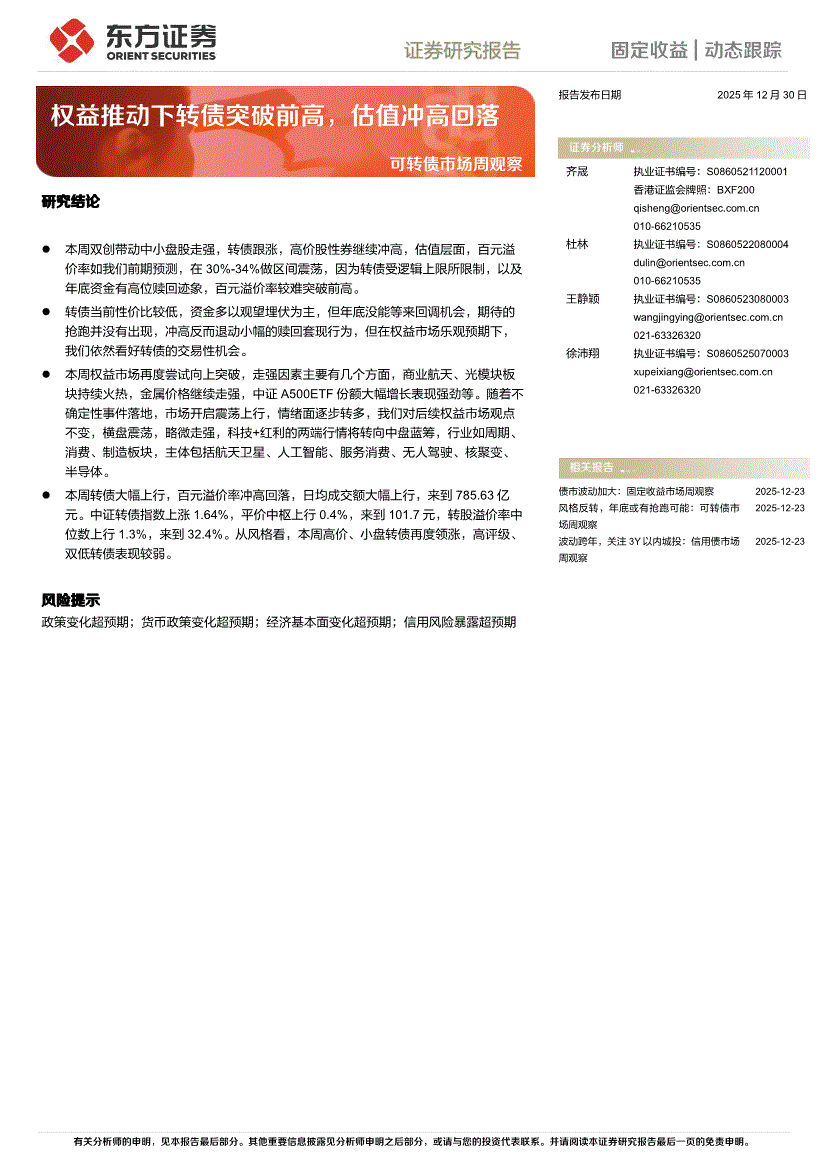 东方证券-可转债市场周观察:权益推动下转债突破前高,估值冲高回落-251230