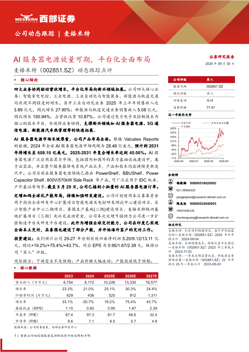 麦格米特:西部证券-麦格米特-002851-动态跟踪点评:AI服务器电源放量可期,平台化全面布局-250930