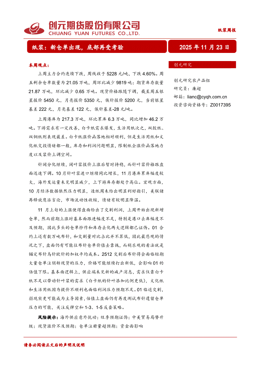 创元期货-纸浆周报:新仓单出现,底部再受考验-251123