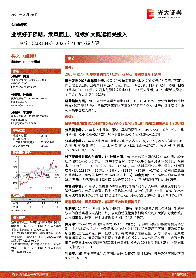 李宁:光大证券-李宁-2331.HK-2025年年度业绩点评:业绩好于预期,乘风而上、继续扩大奥运相关投入-260320