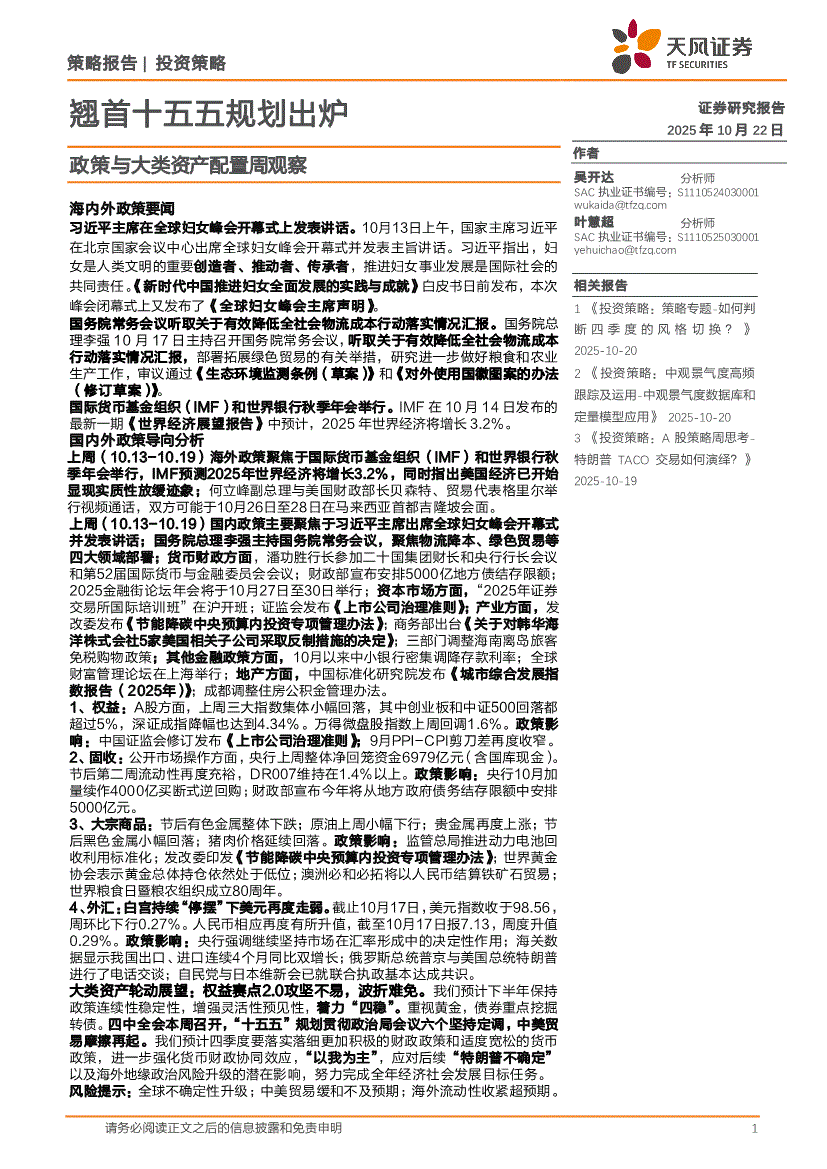天风证券-政策与大类资产配置月观察:十一大事与大类资产梳理-251007