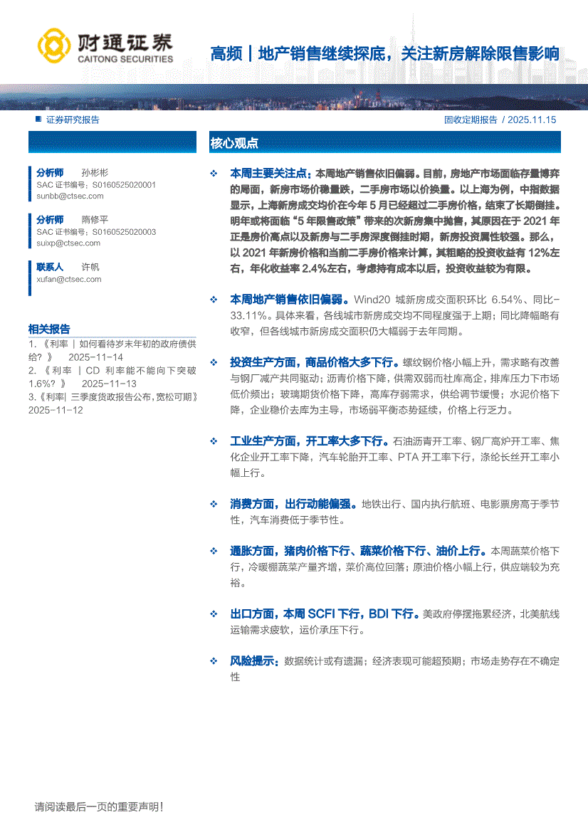 财通证券-高频|地产销售继续探底,关注新房解除限售影响-251115