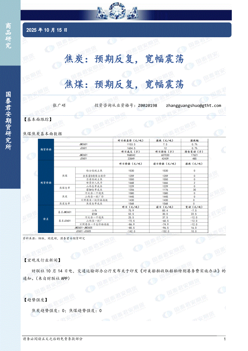 国泰君安期货-焦炭:预期反复,宽幅震荡,焦煤,预期反复,宽幅震荡-251015